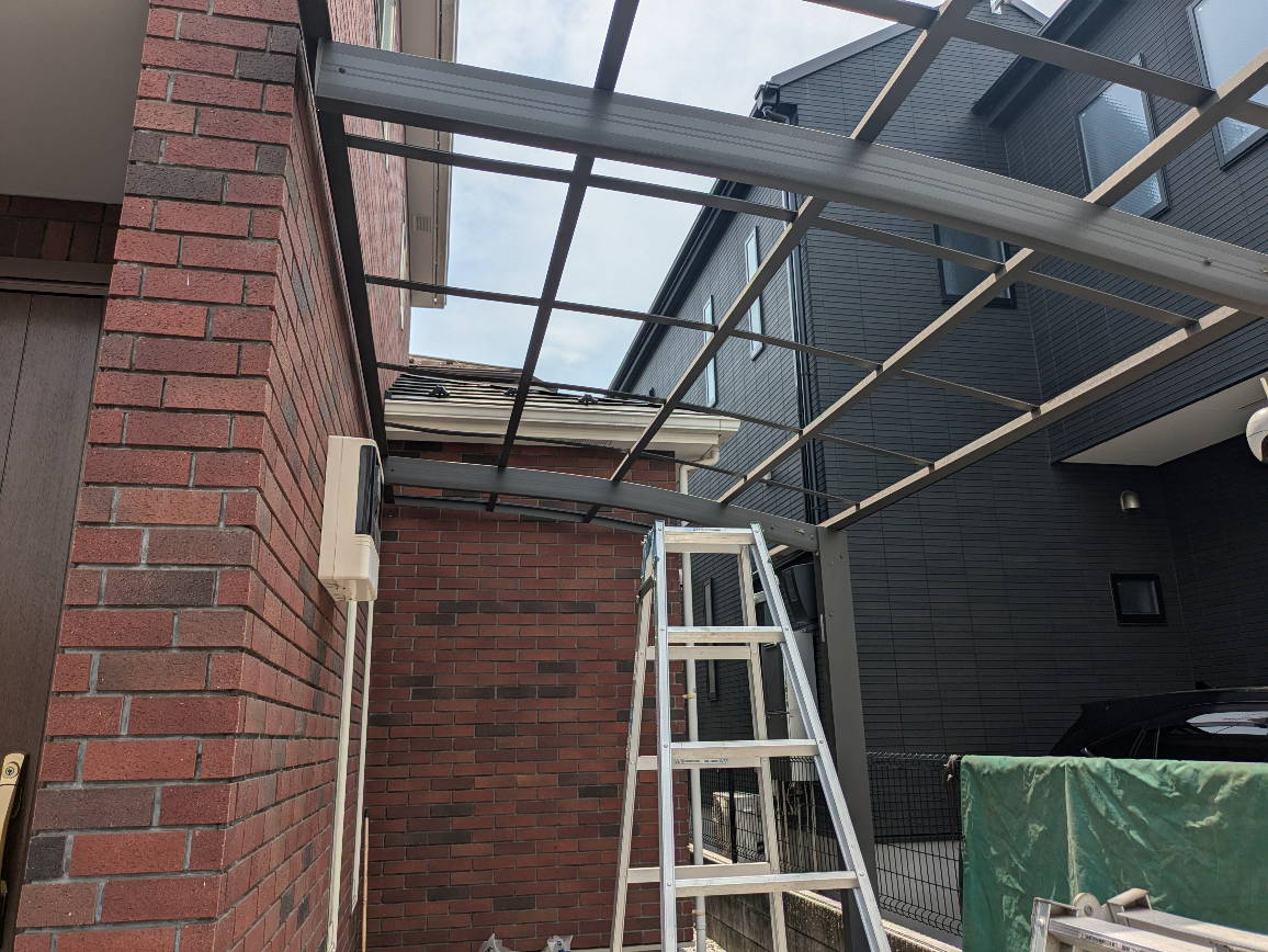 ポリカ屋根は、まだまだしかっりとして劣化もなかったので取り外しはとてもラクでした。劣化してるとポリカ屋根を持ち上げ移動する時に割れてしまいます。今回はなにも心配はなく撤去が進みました。