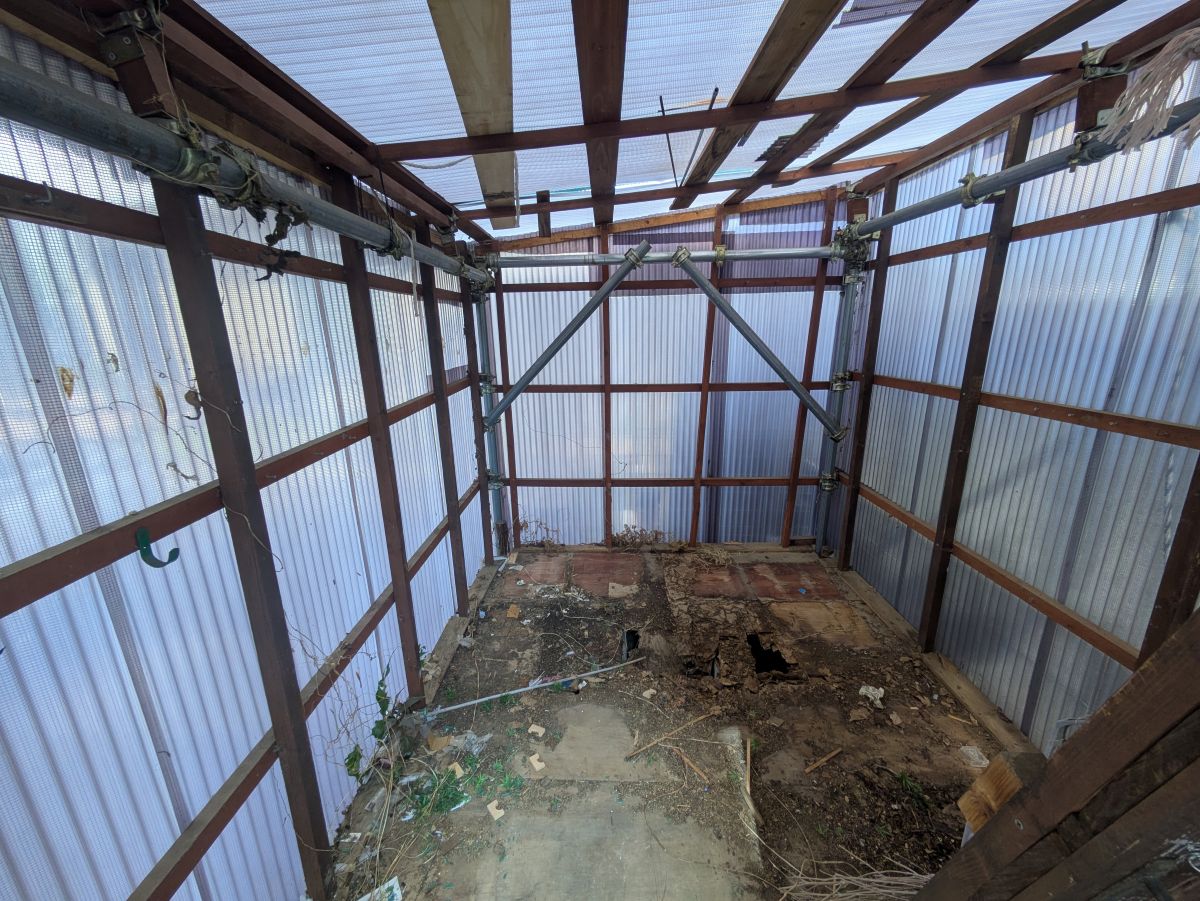 単管パイプと木材を使ったハイブリットな骨組みに波板の屋根と壁で造作されてました。物置入り口もしっかりと扉を作られてました。