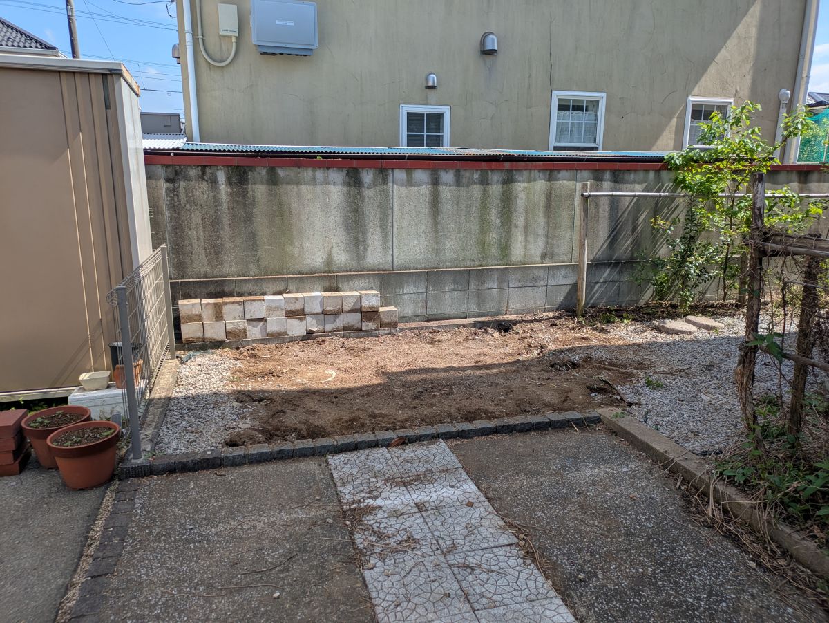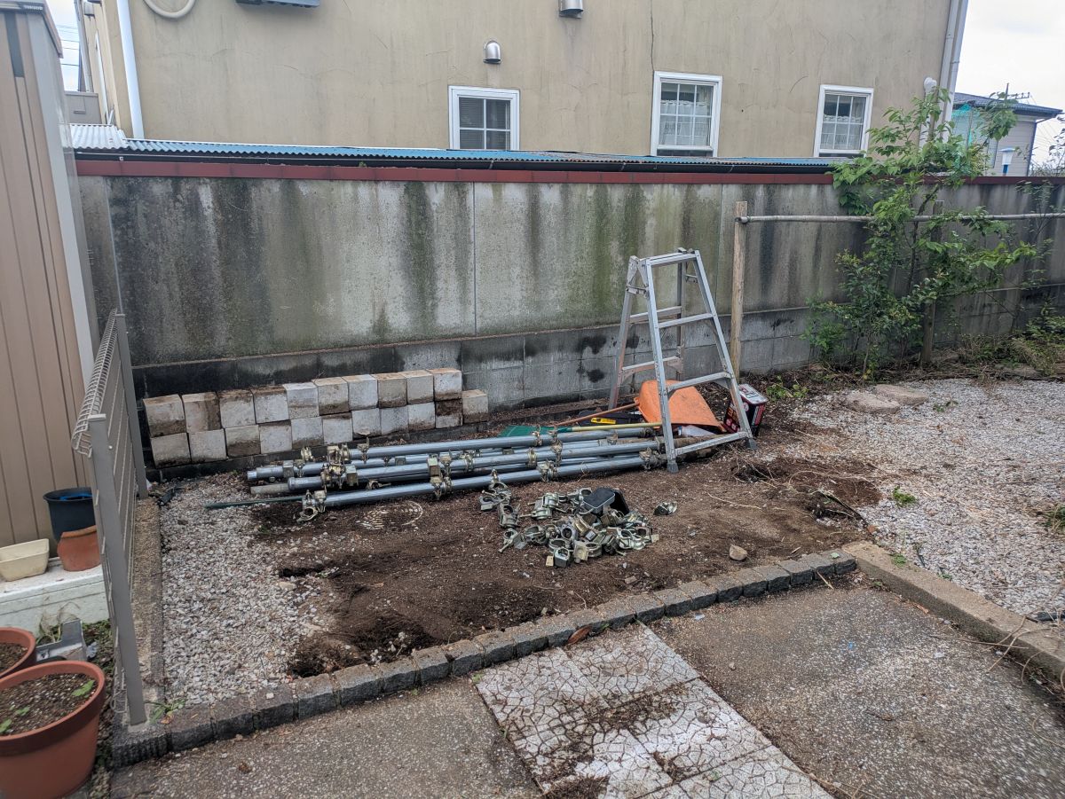 物置内部は大工道具や植木道具等いろんなものがびっしりと入ってたので撤去作業から開始しました。床板のコンパネが腐ってる場所があり、コンパネに嚙まれそうになりながらも全撤去完了