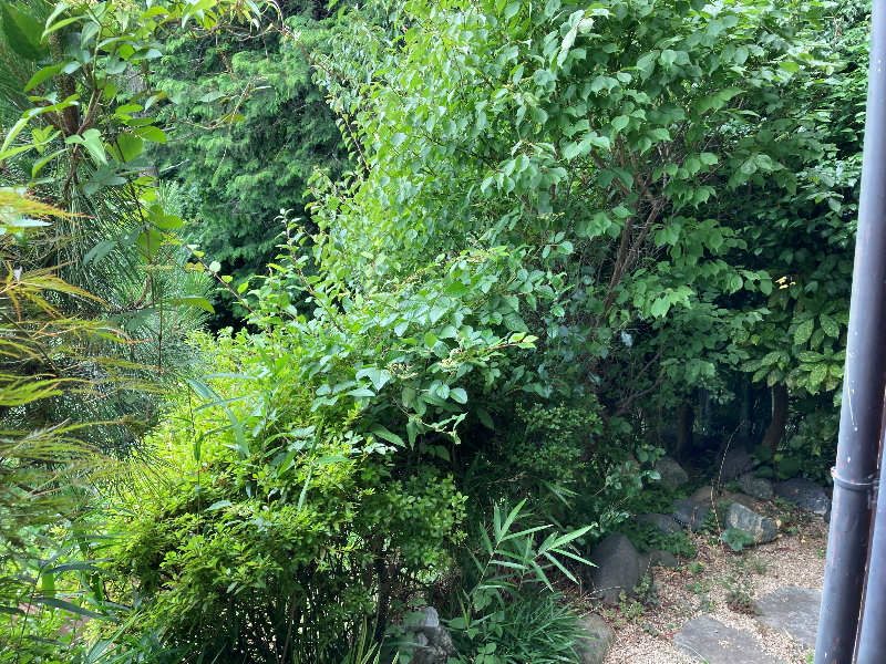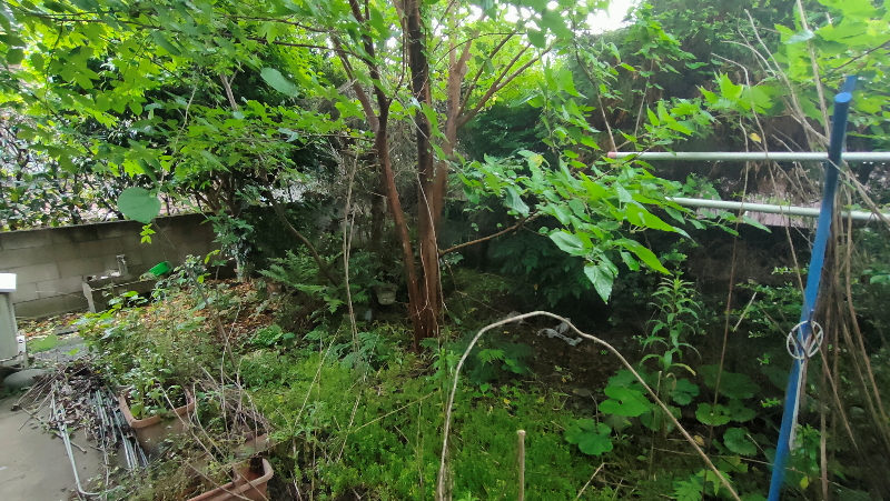 庭の植木はその後容赦なく枝が伸びて、切り落とした枝の処分もそのままでしたので、草が覆いかぶさり茂ってしまった良くない状況になってました