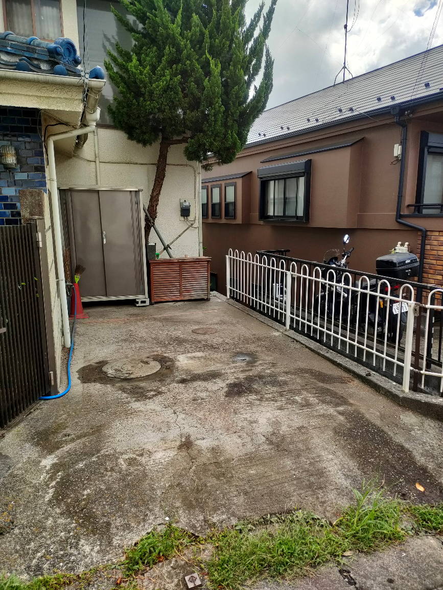 駐車場敷地が丘の上になるので隣の敷地にボルト等が落ちないように、またカーポート後部の植木や物置も気に留めて慎重作業でした。