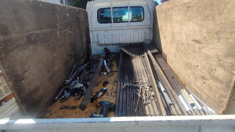 道路近くの一時荷物置き場に、道具と畑から撤去した物を仮置きし、道路際にとめた車に積み込み終了しました。