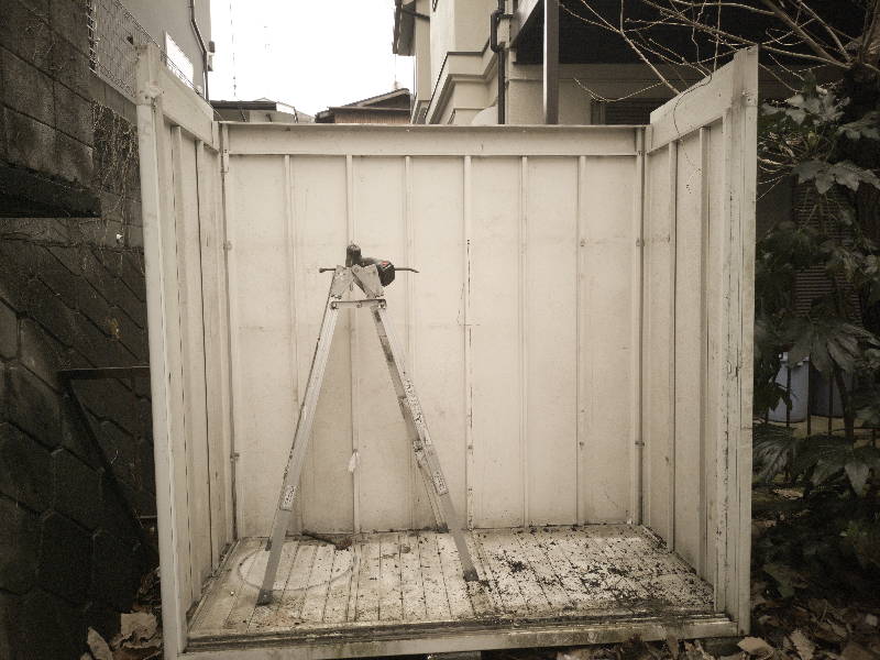 先ず屋根を飛ばされた方から屋根解体を始めました。ポリカ屋根を撤去しながら片流れタイプが2台あるので、繋いであるセンター部は後の1台分と同時に撤去する事に