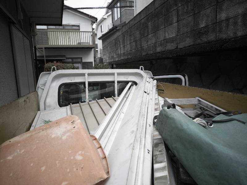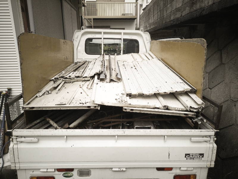 屋根を積み込み飛ばされたポリカ屋根も積み込んで片付けながら解体進行です。梁を全て下した後切断機で2台分の部材を積込み出来る長さに短く切断し再度積み込み