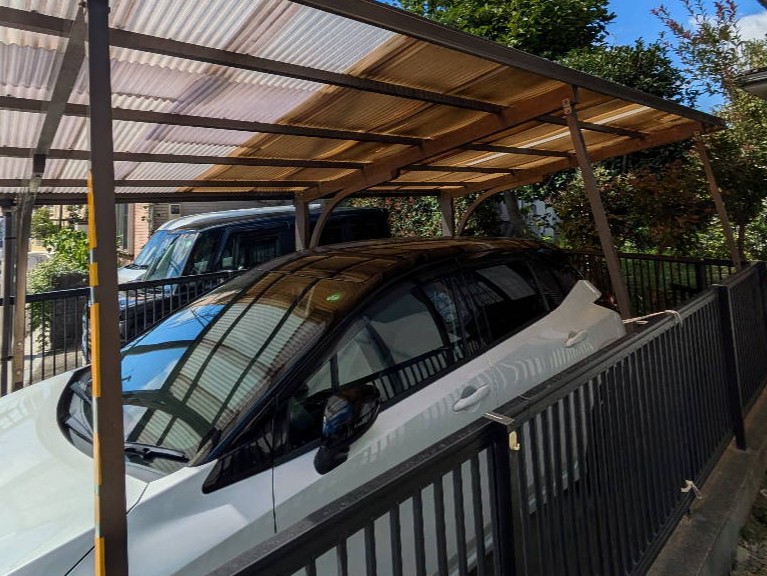 波板屋根のカーポートで、波板が部分破損したり修理もされてあり、波板全交換も提案しましたが、カーポート主柱で駐車場が狭く感じてる事もあり、カーポート解体撤去で作業が決まりました。