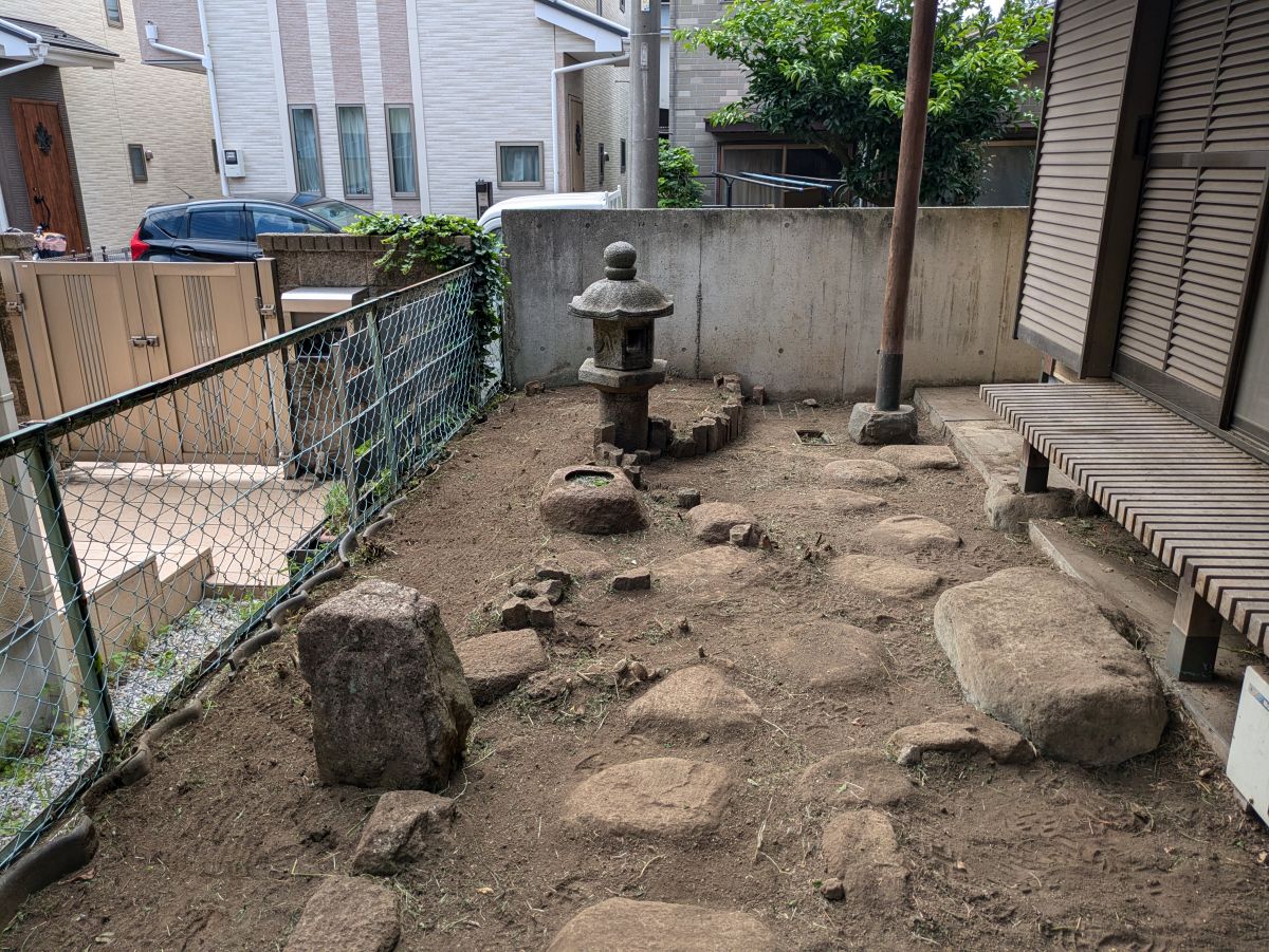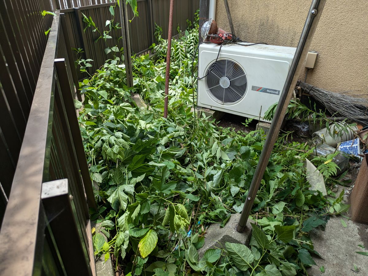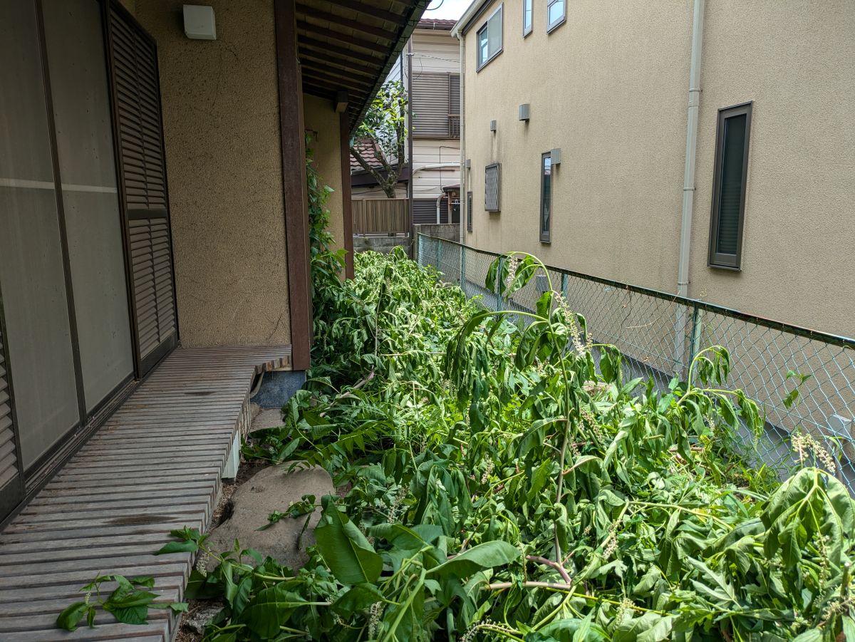庭木の高さは約6メートルでお隣との地境のフェンス荷もたれかかる様に斜めに倒れていました。お隣敷地にはさほど枝もお邪魔してなかったのが幸いでした。フェンスは奇跡的に無事でした。