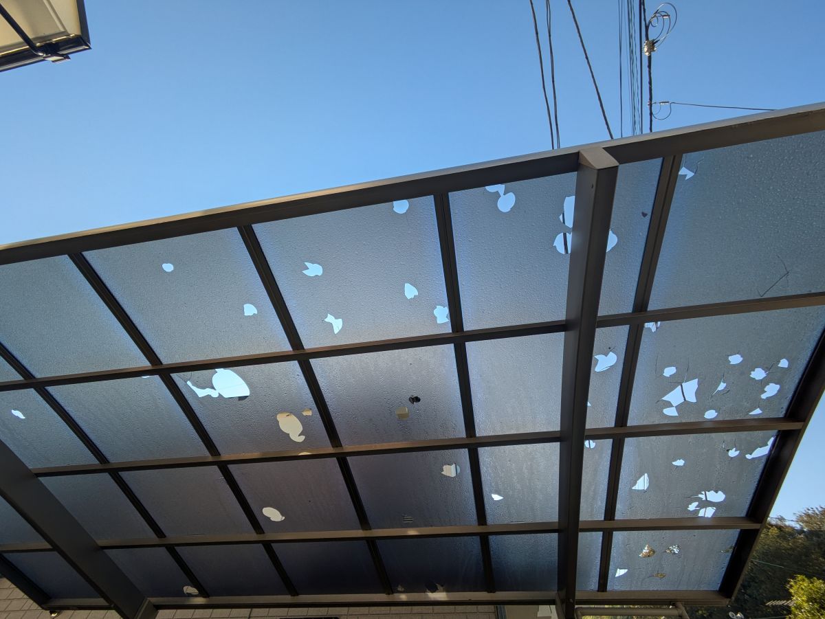 現場にお伺いしたら、ポリカ屋根がひょうにやられて穴だらけになってました。氷の球が空から降ってきたら・・・テレビの特番に出てくるような割れ方でビックリしながら作業開始しました。