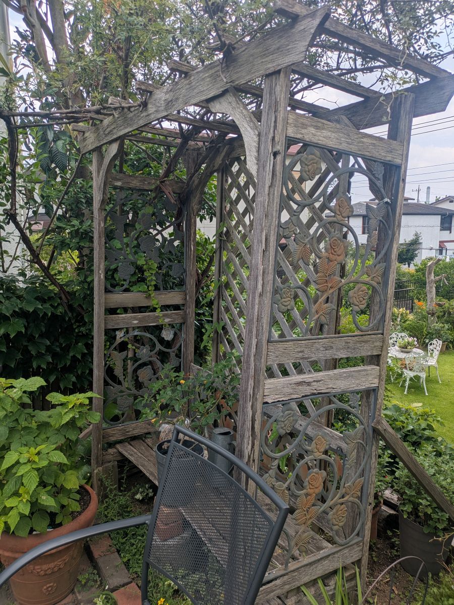先ずはガーデンアーチか取り掛かりました。こちらはハンマーで解体しました。古くなってたので軽く叩いて接合部を外して各パーツに分解し金属パーツも木材より撤去